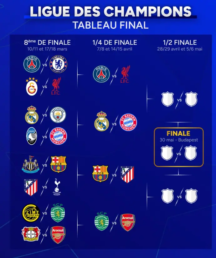 Les affiches des quarts de finale de la UEFA Champions League sont désormais connues. Le Paris Saint-Germain retrouvera le Liverpool FC, qui espère prendre sa revanche après les huitièmes de finale. Deux équipes qui se sont montrées convaincantes lors de ce tour et qui devraient offrir une confrontation très équilibrée. Arsenal FC s’en sort plutôt bien avec une double confrontation face au Sporting CP. Le chemin vers les demi-finales semble accessible, mais attention à l’abnégation portugaise, qui leur a permis de renverser Bodø Glimt au tour précédent. On aura également droit à un duel 100 % espagnol entre Atlético Madrid et le FC Barcelone. Récemment éliminés par les Madrilènes en demi-finale de Coupe du Roi, les Barcelonais auront à cœur de prendre leur revanche. Enfin, une véritable finale avant l’heure opposera le Real Madrid au Bayern Munich. Deux équipes très convaincantes en huitièmes de finale et qui font partie des grands favoris à la victoire finale. Rendez-vous le 8 avril pour les premières confrontations.